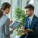 Two business professionals discussing work in a bright office with a tablet, notebook, and whiteboard in the background.